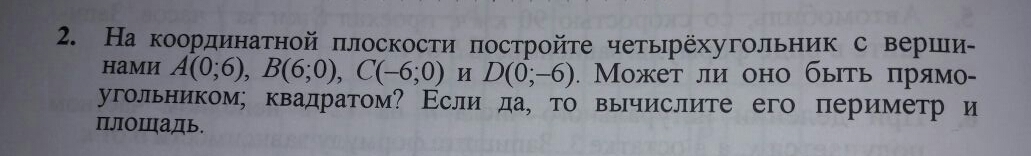 На координатной плоскости постройте четырехугольник с вершинами А ( 0;6 ), В( 6;0 ) С ( - 6;0 ), и D ( 0;- 6 ). Может ли оно быть прямоугольника, квадратом? Если да то вычислите его периметр и площадь. пожалуйста помогите очень срочно !