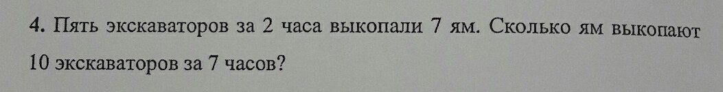 3,5 * 2 = 7 (ям) ----- столько ям выкопают ДЕСЯТЬ экскаваторов за ОДИН час, так как 10 экскаваторов сделают за час в 2 раза больше ям, чем за пять.