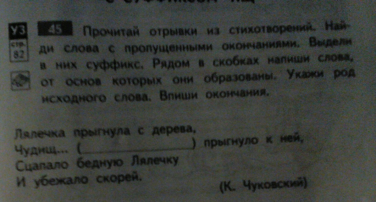 прочитай отрывки из стихотворений.найди слова с пропущеными окончаниями.Выдели в них суффикс. Рядом в скобках напиши слова , от основ которых они образованы.укажи род исходного слова. Впиши оканчания