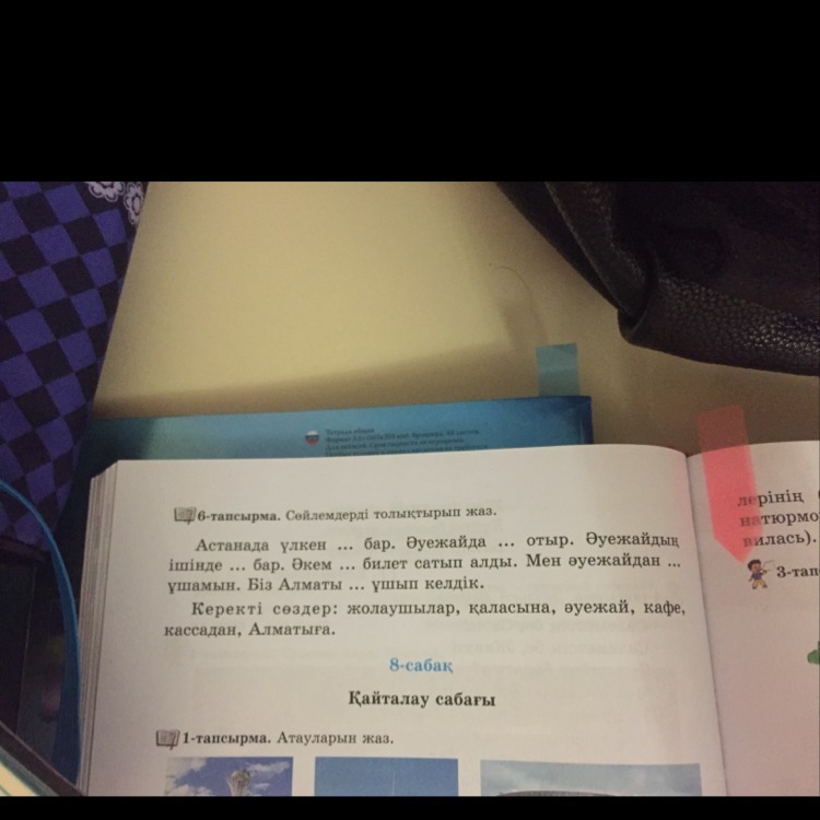 Астанада үлкен кафе бар. Әуежайда жолаушылар отыр. Әуежайдың ішінде касса бар. Әкем Алматыға билет сатып алды. Мен әуежайдан Алматыға ұшамын. Біз Алматы қаласына ұшып келдік.