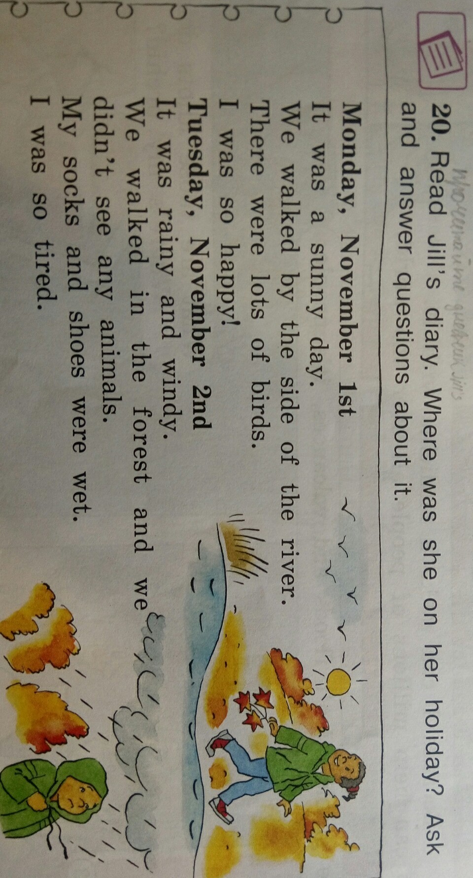 1What's the weather like in first November?2Where we walked?3How many birds were there ?