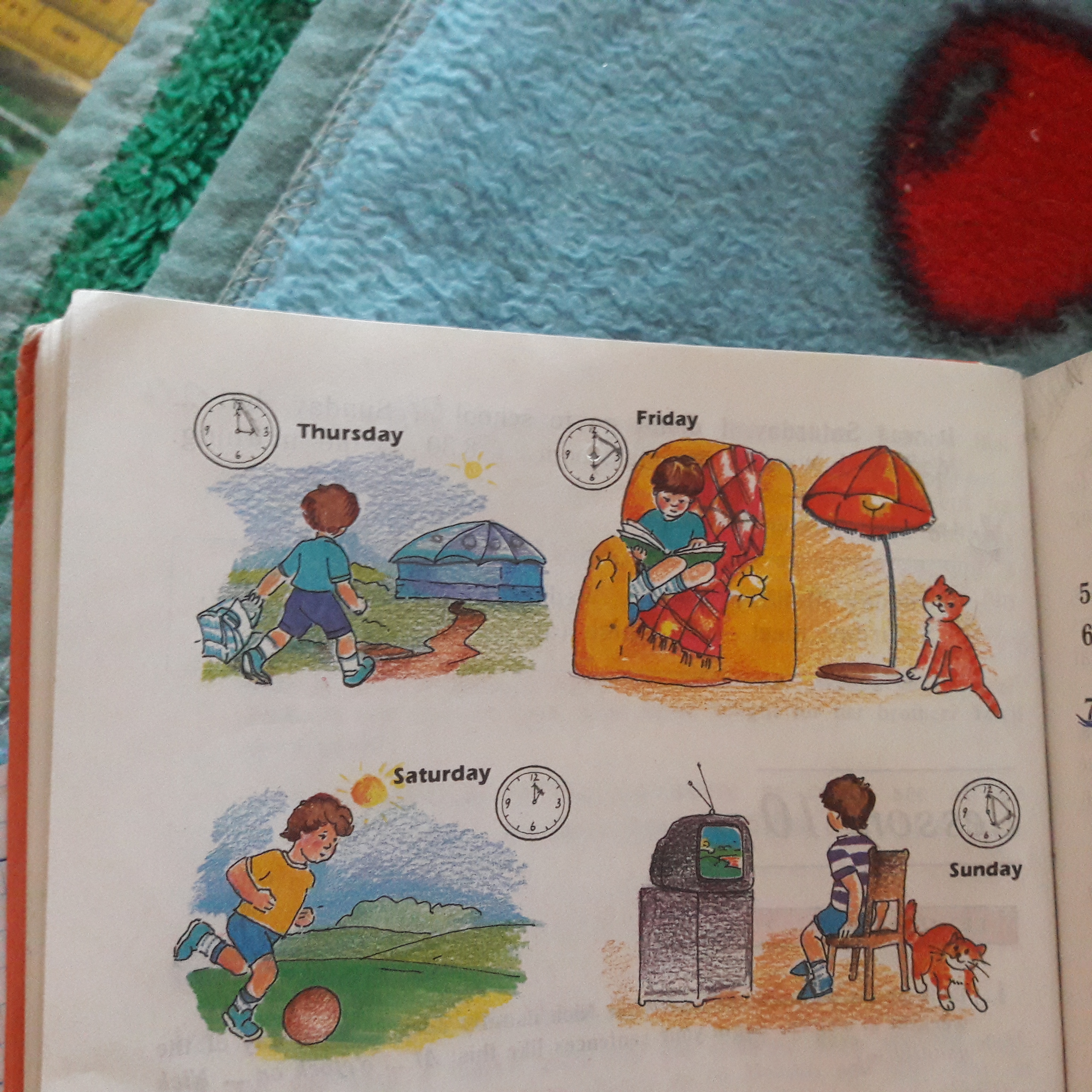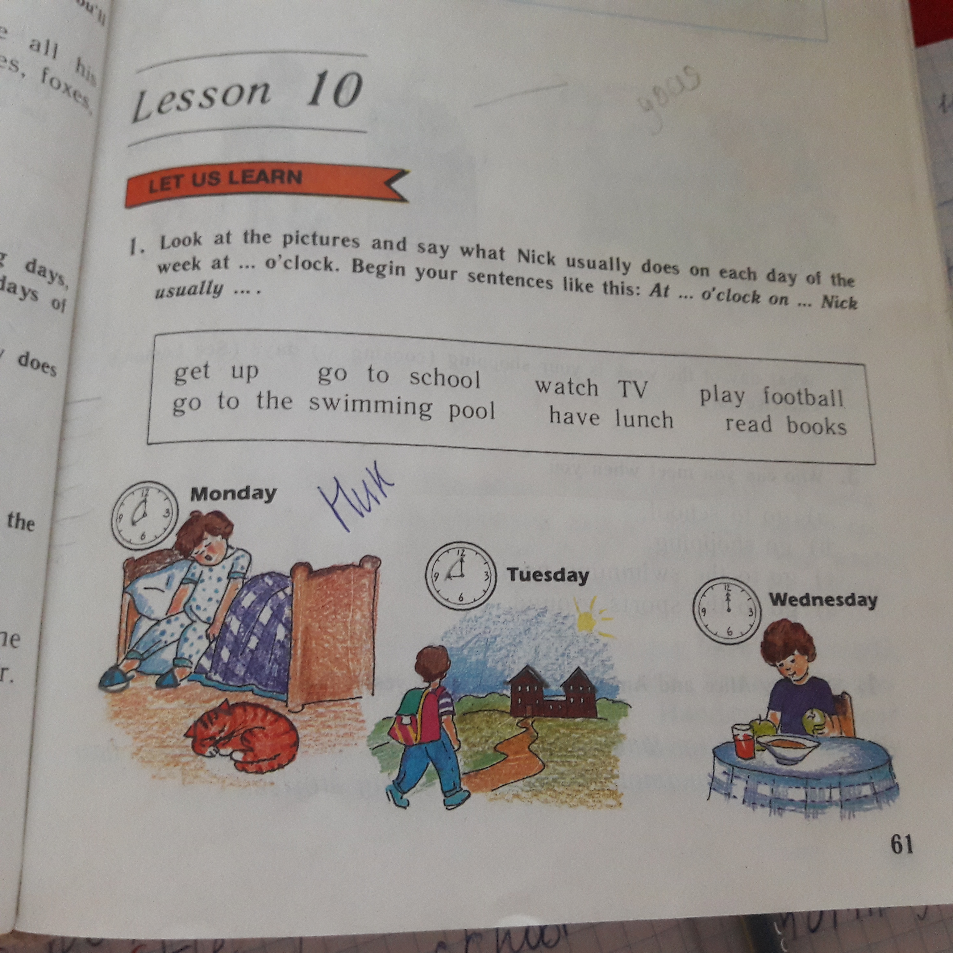 At eight o`clock on Monday Nick usually gets up. At nine o`clock on Tuesday he usually goes to school. At twelve o`clock on Wednesday Nick usually Has lunch. At three o`clock on Thursday he usually Goes to the swimming pool/ At six o`clock on Friday he usually reads books. At one o`clock on Saturday Nick usually plays football. At five o`clock on Sunday Hick usually watches TV.