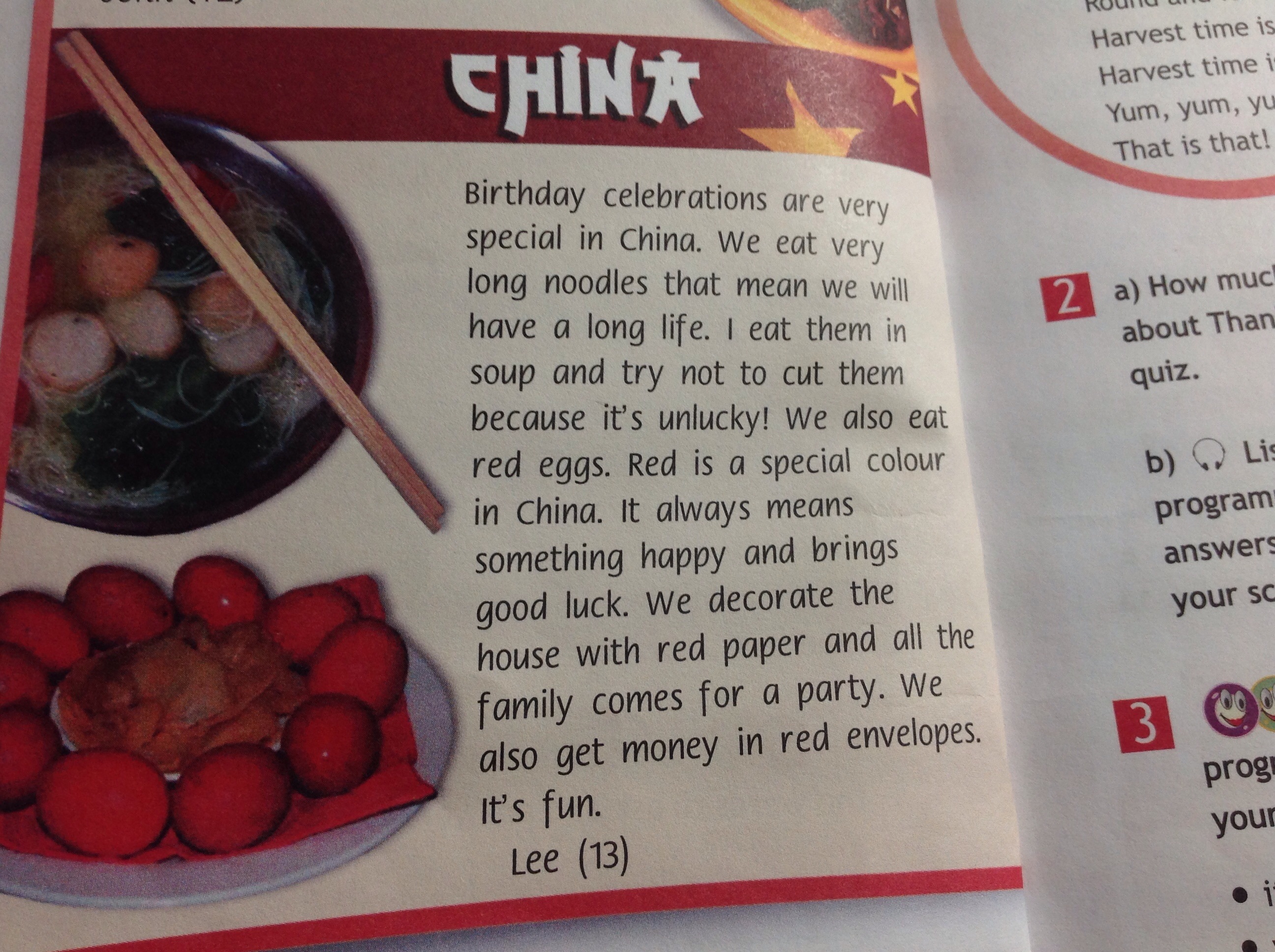 Празднование дня рождения очень особенное в Китае. Мы едим очень длинную лапшу, что означает, что у нас будет долгая жизнь. Съешьте их в супе и постарайтесь не резать их, потому что это несчастливо! Мы также едим красные яйца. Красный - это особый цвет в Китае. Это всегда означает что-то счастливое и приносит удачу. Мы украшаем дом красной бумагой, и вся семья приходит на вечеринку. Мы также получаем деньги в красных конвертах. Это весело. Ли (13)