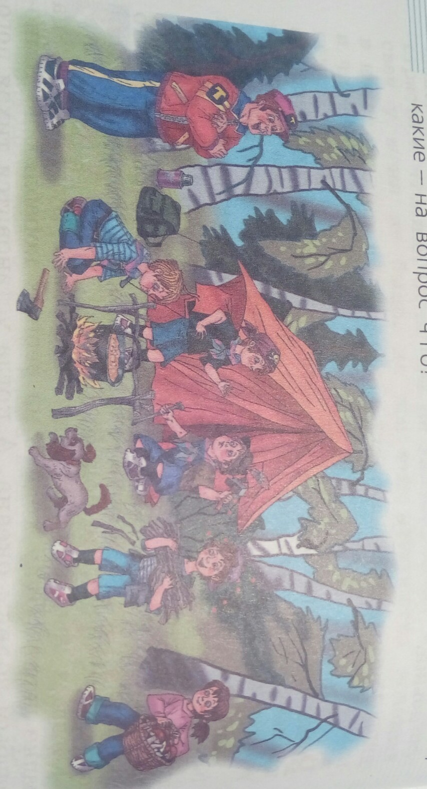 Меня и моих друзей Колю, Ритку, Вадика и Славу отправили в лагерь . Нашего вожатого звали Степан Фелексович. Он очень любил походы и совместные прогулки. И вот как-то раз мы пошли в поход . Мы пытались расставили палатку возле кустов и берёз. Я носил тростника чтоб костёр не потух. Славка готовил обед. Коля и Вадик не как не могли поставить палатку. А Ритка носила грибы из лесу. Ну а Степан Фелексович следил за всем. Когда мы всё сделали мы решили поиграть долго мы играли и Степан Фелексович жал команду спать и мы легли. Ну как-то так не уверена но всё же