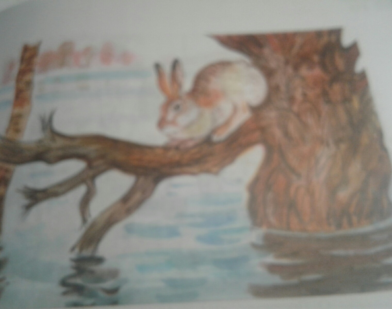 На картине А.Н.Комарова «Наводнение» изображен заяц, попавший в беду. В один из больших весенних разливов русак оказался на затопленном островке. Спасаясь от наводнения, он догадался и сумел забраться на дерево.