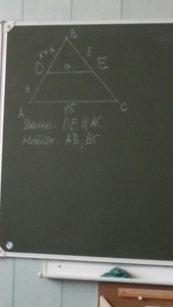 тк линии параллельны,то треугольники подобны, по 2 углам у основания, составим соотношения сторон, х+6/10 как х+х+6/15, х+6/10= х+х+6/15, перемножим части уравнения на 15 и на 10, получим 15х+90=20х+60, 5х=30, х=6, АВ=6+6+6=18, обозначим х , кусок от ВС, ВС=8+х т.к треугольники подобны, то 8+х/15= 8/10, приводим к целому виду перемножая части уравнения на 10 и 15 соответственно - 120=80+х; х=40, ВС=40.