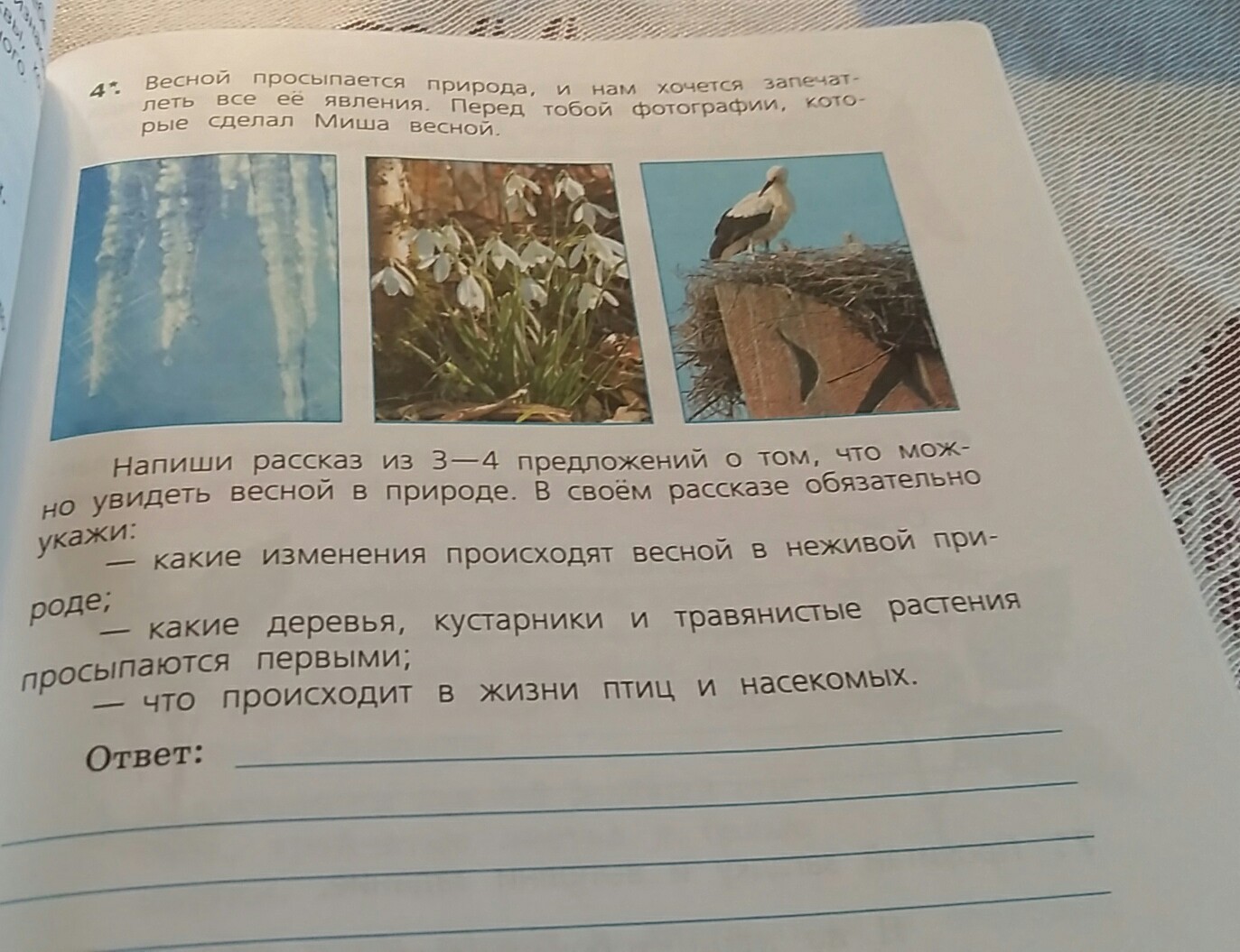 весной просыпаются все живые существа.Тает снег,бегут ручьи.Вырастает трава и подснежники.Птицы строят гнезда и выводят потомство.