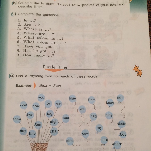sNOW-know, day-play, fine-nine, Sam-Pam, By-my, run-son, see-we, chare-hare, toy-boy, you-blue, how-cow, tag-bag, eight-skate, bear-where