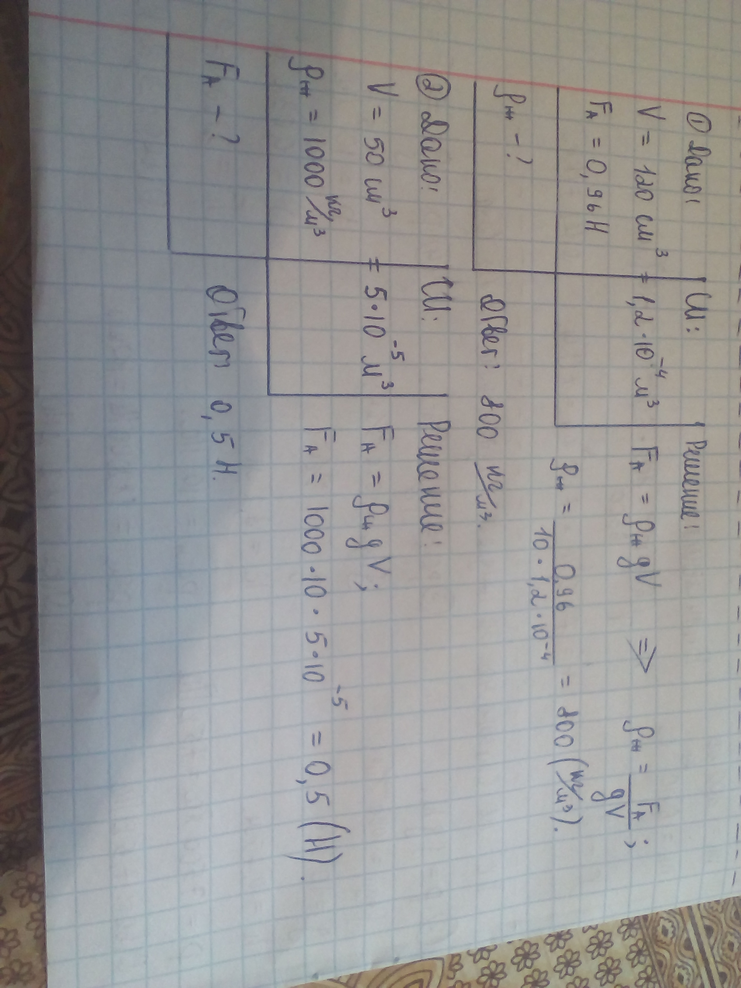1)На тело объемом 120 см(3), полностью погруженное в жидкость, действует Архимедова сила 0,96Н. Какова плотность жидкости?