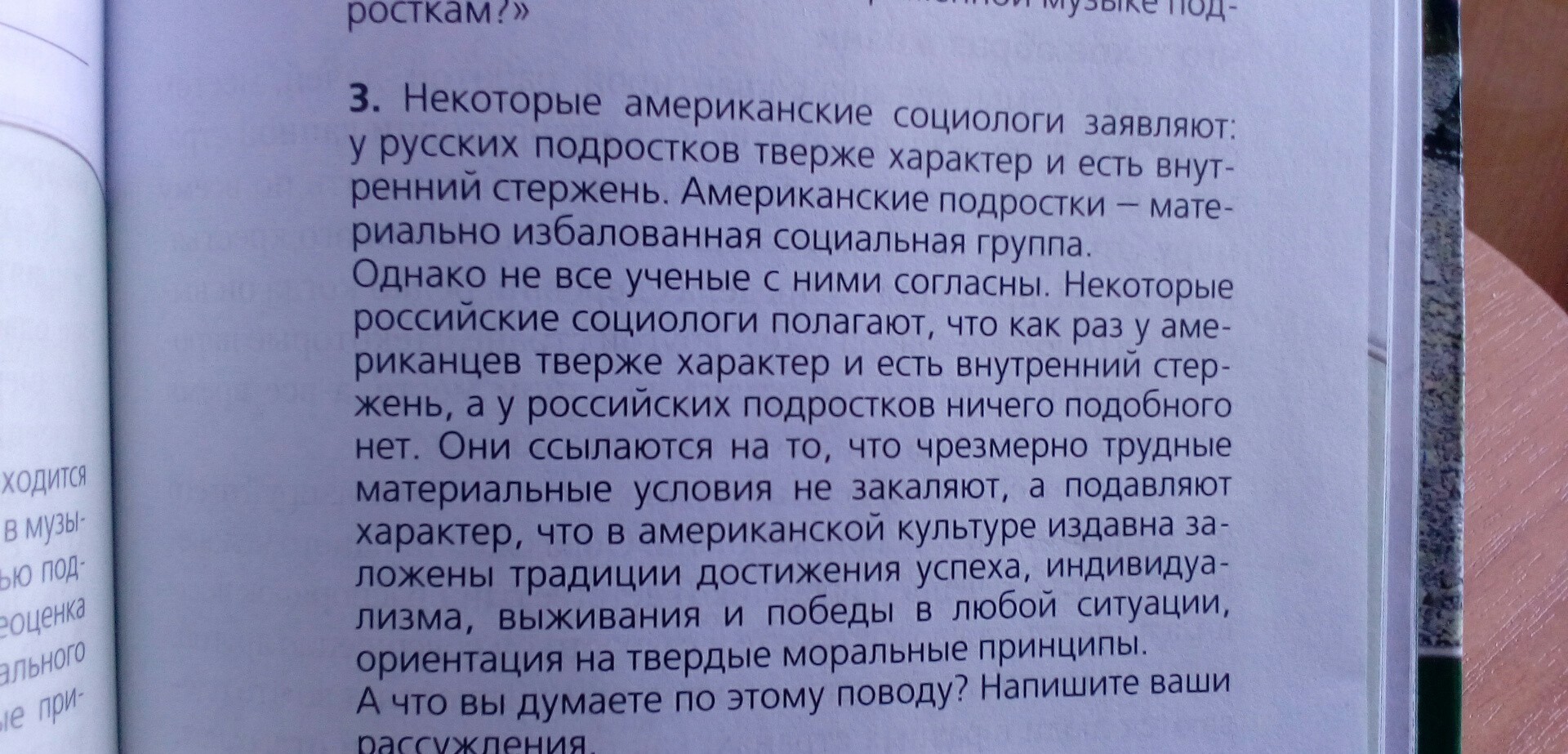 Я считаю, что в действительности, у русских подростков тверже характер и есть внутренний стержень. Характер формируют трудности и испытания, которые проходит личность с самого раннего детства. И так получилось, что в России условия действительно хуже, чем в Америке, и трудностей следовательно больше. А значит и возможностей для формирования стойкости и ответственности больше. Что нельзя сказать о американских детях, у которых благоприятные условия и тихая жизнь сопутствуют в течении всего детства-важного периода для формирования человека как личности. И при столкновении с проблемой, у них нет навыков для их решения. Так что, я согласна, что русские подростки имеют более твердый характер.