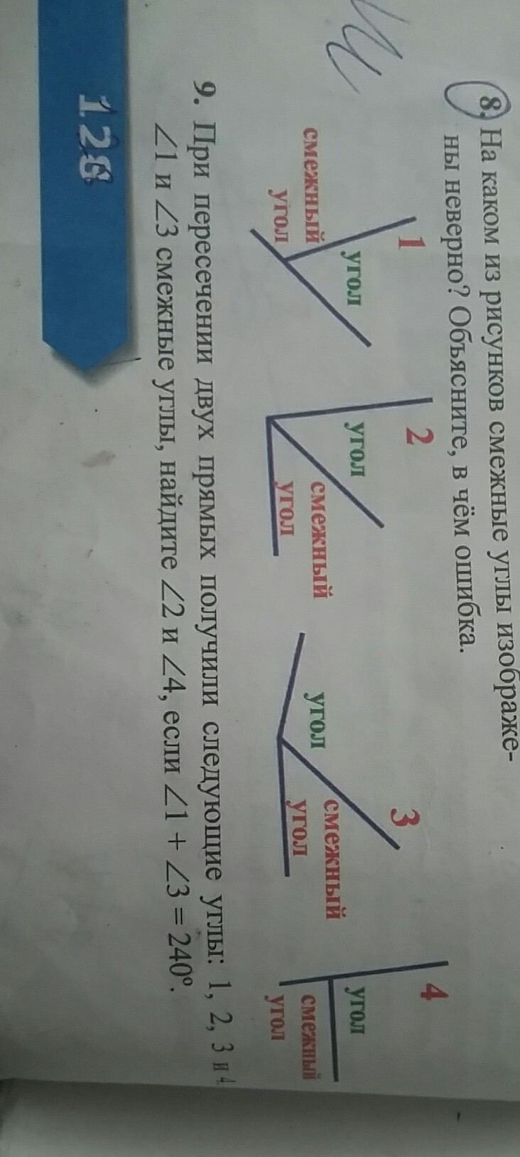 смежные углы изображены неверно на 2 и 3 картинках,т.к. смежные углы в сумме образуют 180°