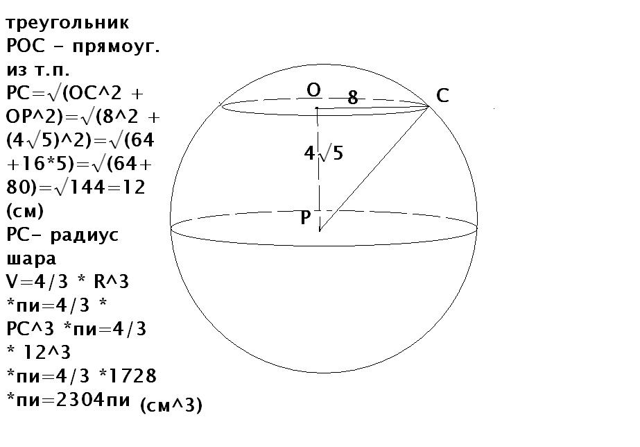 Сечение шара плоскостью, отстоящей от центра шара на расстоянии 4 см, имеет радиус 8 см. Найдите объем шара