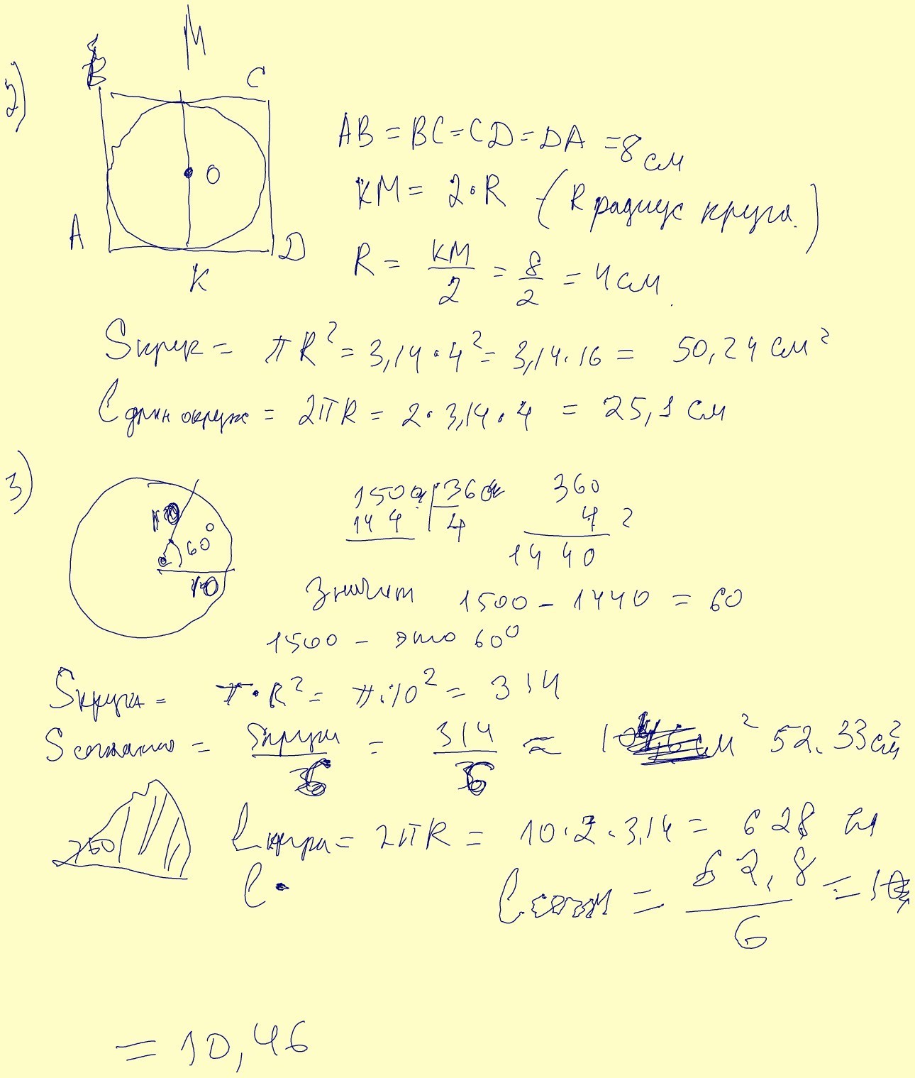 2) Найдите площадь круга и длину ограничивающей его окружности, если сторона правильного четырехугольника, описанного около него, равна 8 см.