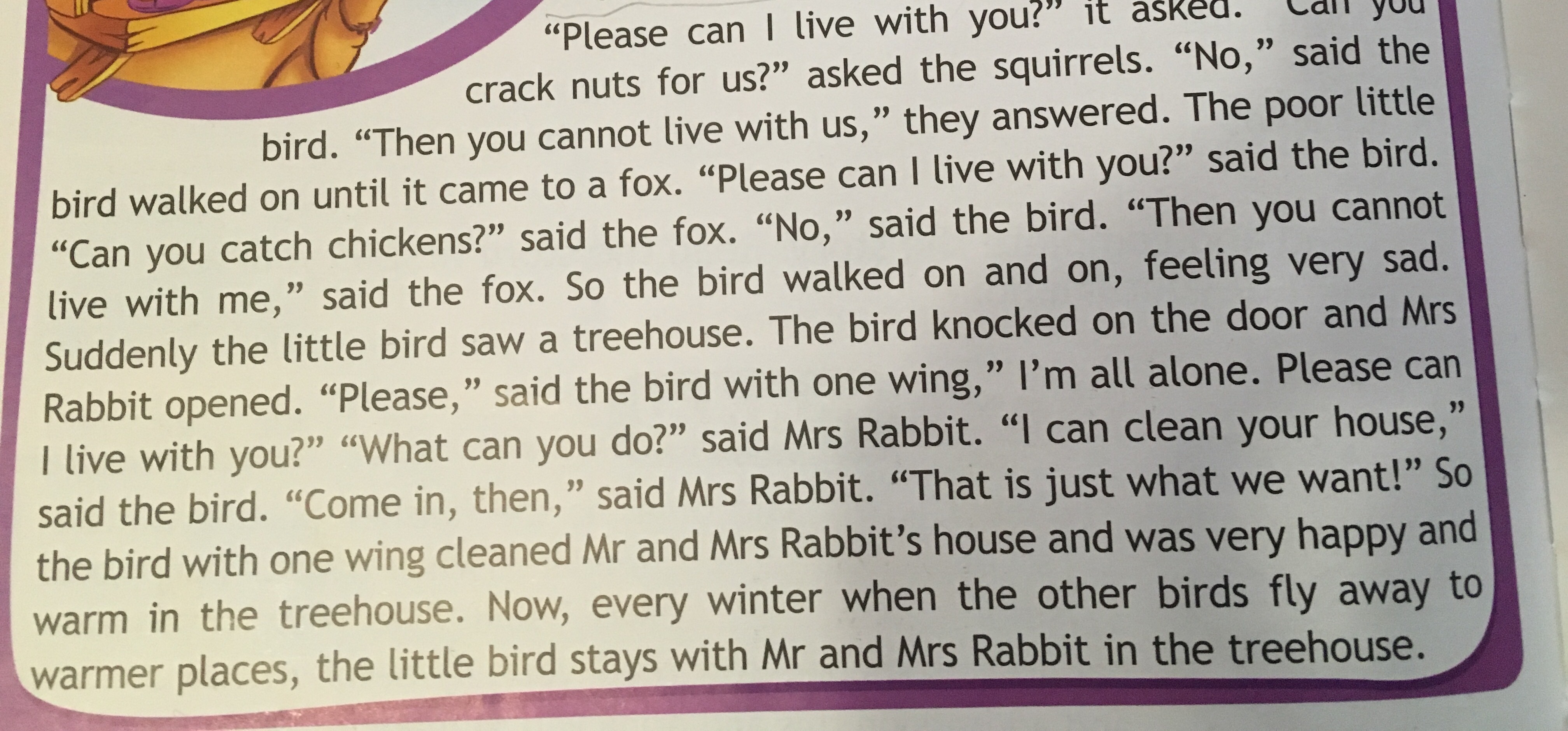 Пожалуйста, мы с тобой трескучим тресковые орехи? »- спросили белки.« Нет, - сказала птичка. «Тогда вы не можете жить с нами», - ответили они. Бедная маленькая птичка шла до нее до лисы. «Пожалуйста, я могу жить с тобой?» - сказала птица. Пришел «Можете ли вы поймать цыплят?» - сказал Лис. «Нет, - сказала птица, - тогда ты не можешь жить со мной», - сказала лиса, и птица продолжала и продолжала, чувствуя себя очень грустной. Вдруг маленькая птичка увидела деревянный домик. Птица постучала в дверь, и миссис Кролик отворилась. «Пожалуйста», сказала птичка с одним крылом. Я совсем одна. Пожалуйста, можешь жить с тобой? "Что?" - сказала миссис Кролик. Я могу убрать твой дом, ты можешь сказать птицу. «Входите, - сказала миссис Кролик, - именно этого мы и хотим». Итак, птица с крылом очистила дом мистера и миссис Кролик, и была очень счастлива, и одна из них была теплой в дереве. Теперь, каждую зиму, когда другие птицы улетают Теплые места, маленькая птичка остается с мистером и миссис Кролик в теплице.