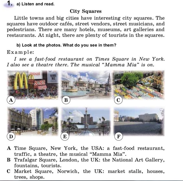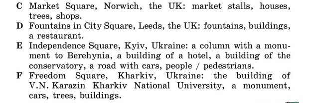 1)Городские площади Маленькие города и большие города имеют интересные городские площади. На площадях есть открытые кафе, уличные торговцы, уличные музыканты и пешеходы. Есть много отелей, музеев, картинных галерей и ресторанов. Ночью на площадях много туристов.
