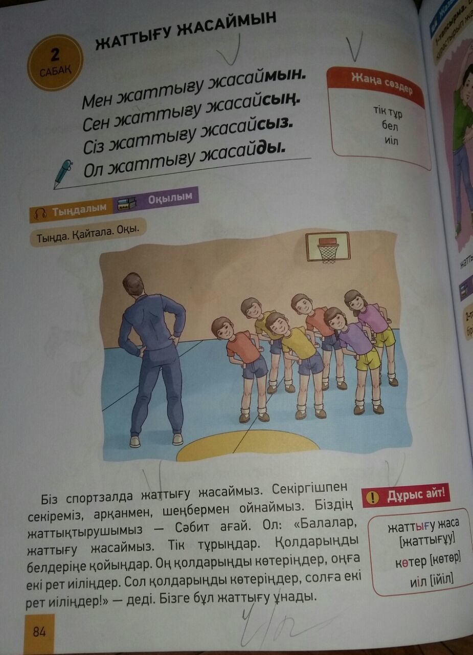 мы в спортзале делаем упражнения .Прыгаем на скакалке и играемся.Наш физрук-Сабит.Он говорит "Дети делаем упражнения.Стойте прямо.Поставьте свои руки на талию.Поднимите правую руку,изгибайтесь два раза направо.Поднимите левую руку,изгибаетесь налево два раза