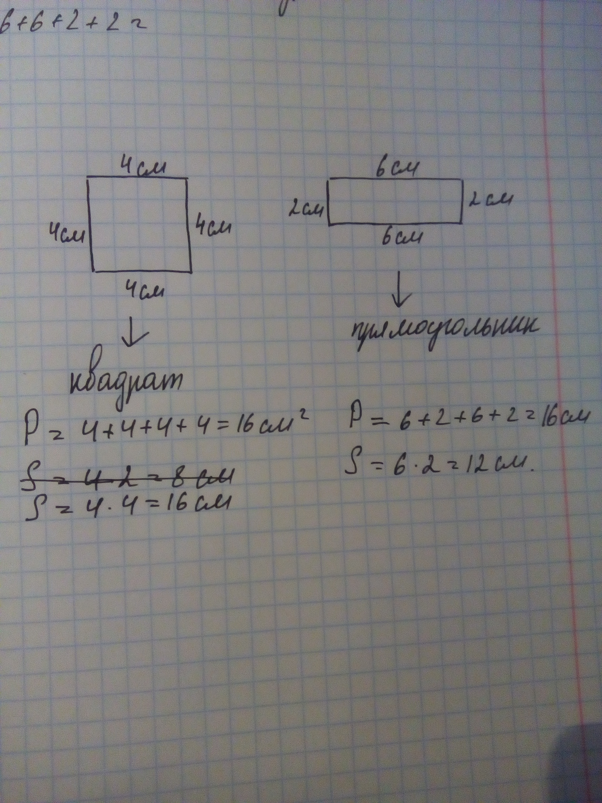 Начерти прямоугольник и квадрат с одинаковым периметром, равным 16 см. Найди площадь полученных фигур.