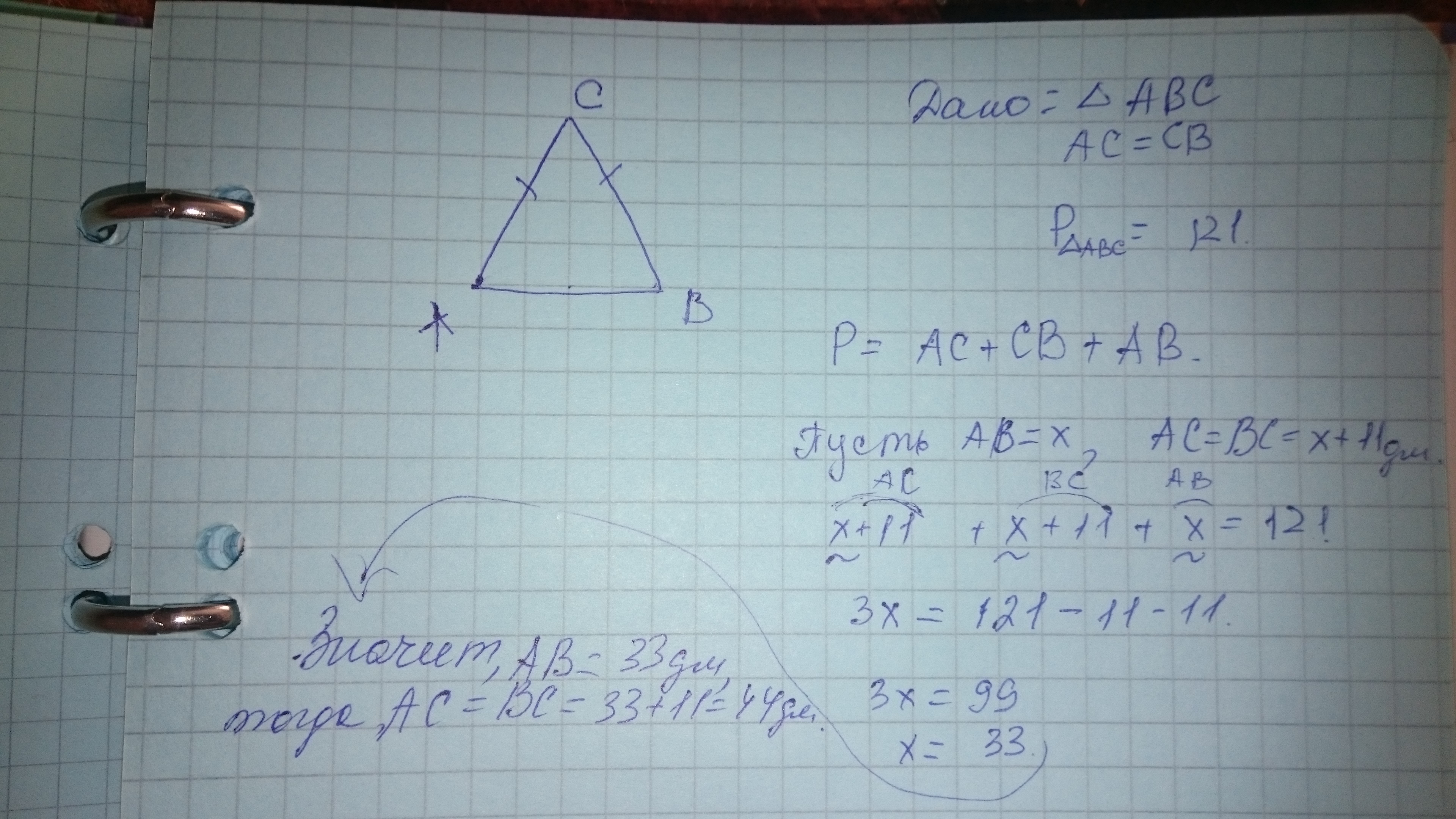 Дано: ΔBCA,CB=AC. Основание треугольника на 11 дм меньше боковой стороны. Периметр треугольника BCA равен 121 дм. Вычисли стороны треугольника.