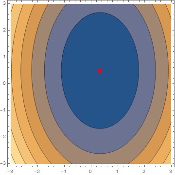 Первый элемент >0, определитель матрицы H >0, следовательно стационарная точка x=1/3, y=1/2 является локальным минимумом.