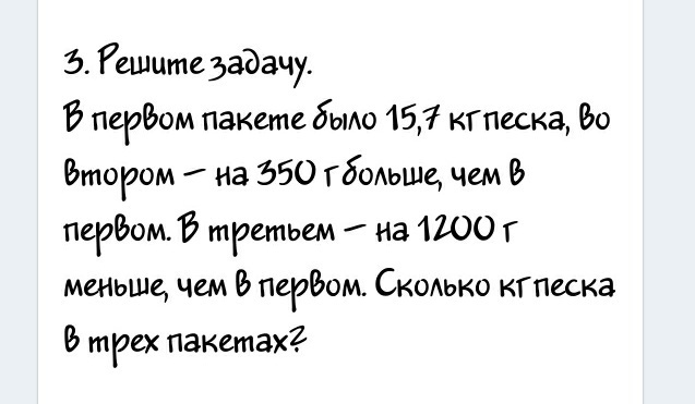 15700+350=16050(гр)второй 15700-1200=14500(гр)третий мешок 15700+16050+14500=46250 грамм