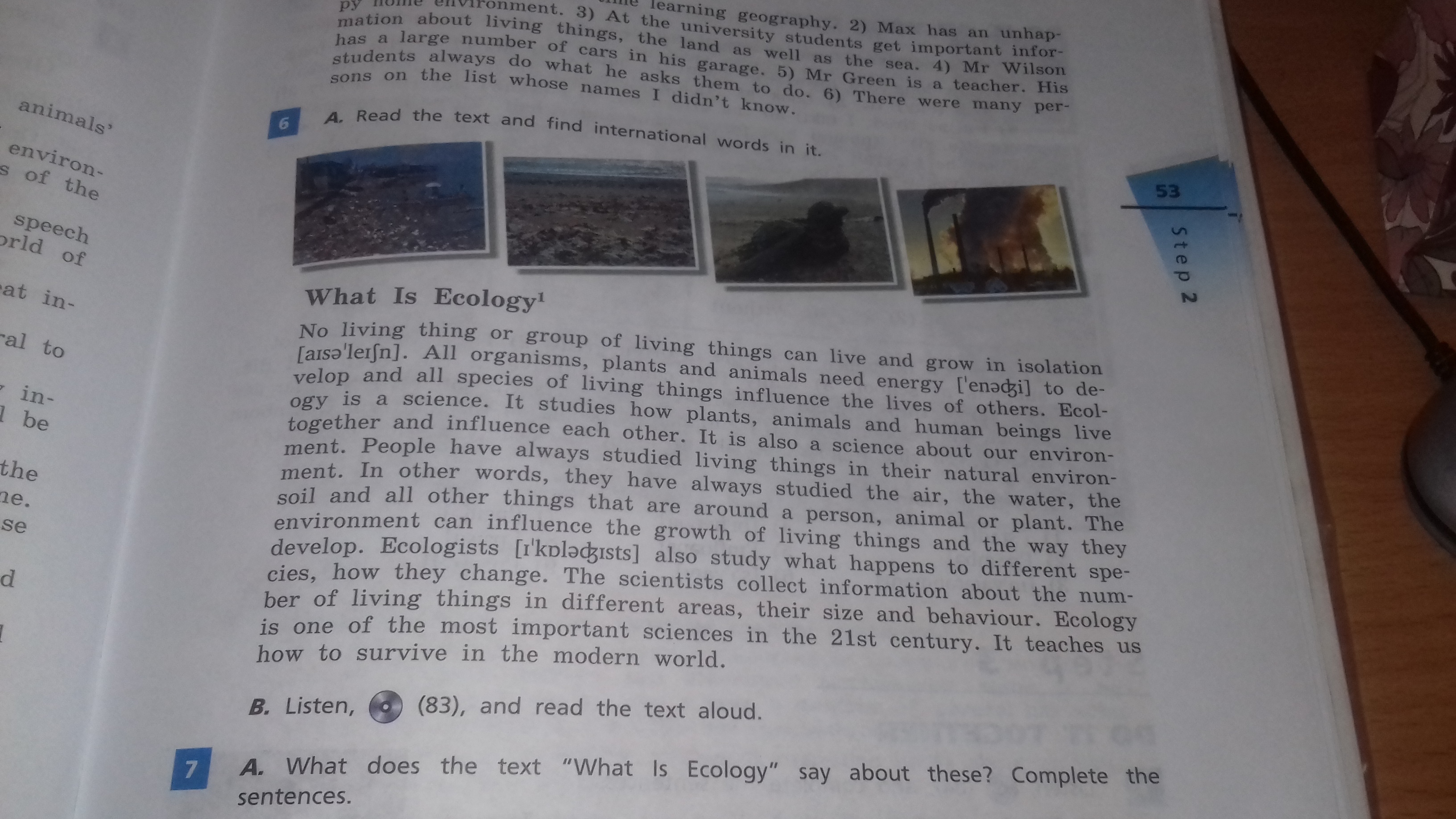 В изоляции не может жить и развиваться ни одно живое существо или группа живых существ. Всем организмам, растениям и животным, нужна энергия для развития, и все виды живых существ влияют на жизнь других. Экология - это наука. Она изучает, как растения, животные и человеческие существа живут вместе и влияют друг на друга. Она также является наукой о нашей окружающей среде. Люди всегда изучали живых существ в их естественной окружающей среде. Другими словами, они всегда изучали воздух, воду, почву и другие объекты, находящиеся вокруг человека, животного или планеты. Окружающая среда может влиять на рост живых существ и способ их развития. Экологи также изучают, что происходит с разными видами, как они меняются. Учёные собирают информацию о количестве живых существ, живущих на разных территориях, их размере и поведении. Экология является одной из самых важных наук в двадцать первом веке. Она учит нас, как выживать в современном мире.