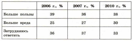 По данным, представленным в таблице, нельзя сделать вывод о том, что число одобряющих или относящихся к глобализации с презрением как-то уменьшилось или увеличилось. За представленные годы треть населения считала глобализацию полезной для России, треть - вредной, и треть ничего не могла ответить на это. То есть тенденции к снижению сочувствующих глобализации или осуждающих никак не изменилось. Отношение россиян за 2006 год, 2007 год и 2010 год не изменилось и осталось прежним.
