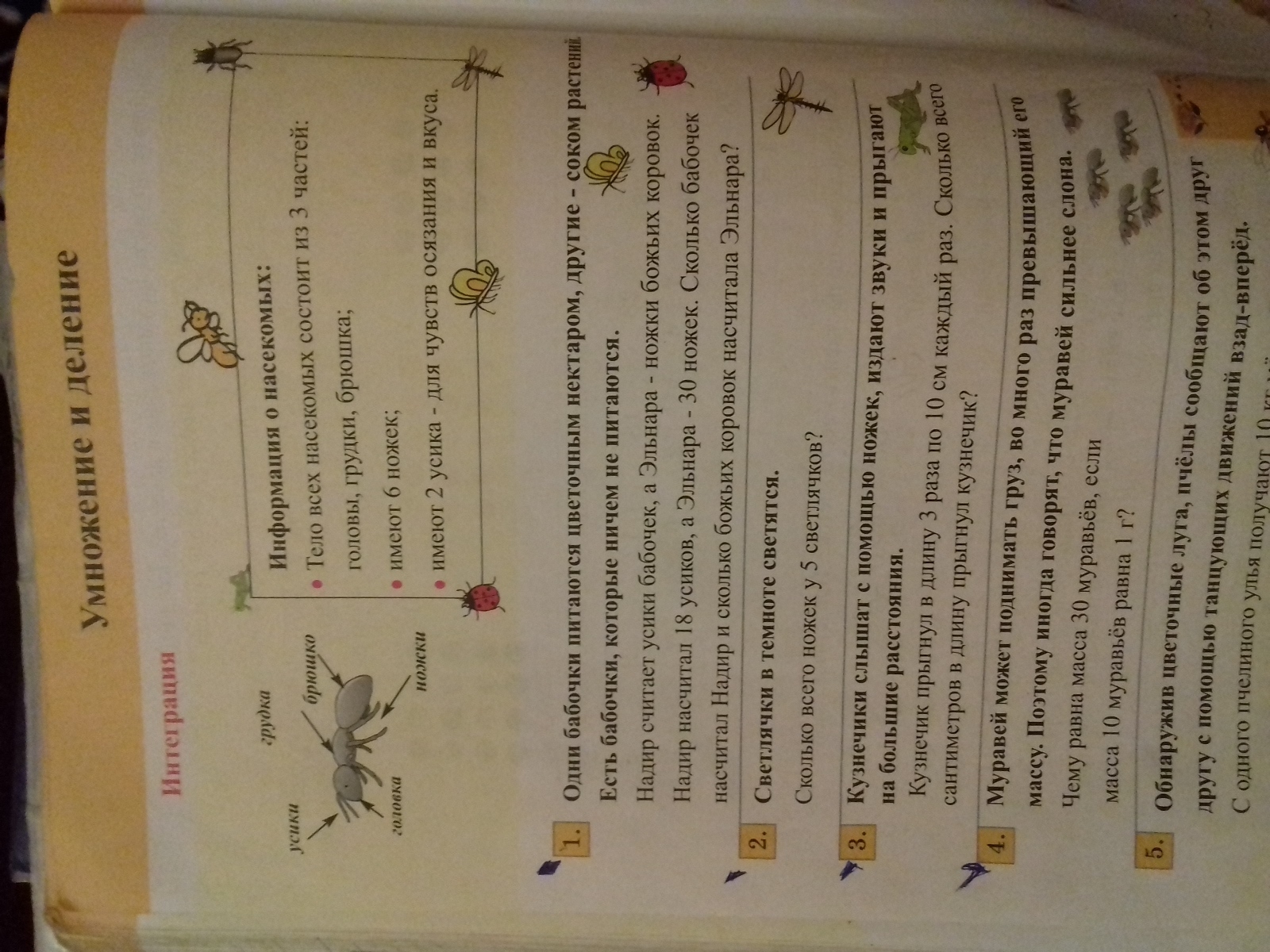 1)5*6=30(ножек) у пяти светлячков