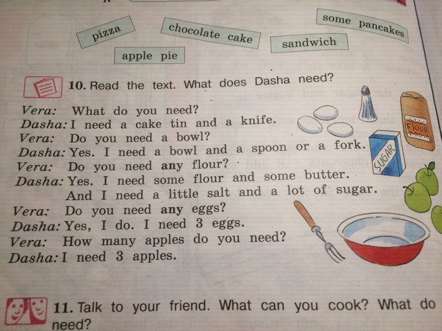 Dasha need: A cake tin and knife. Bowl and a spoon or a fork. Some flour and some butter. A little salt and a lot of sugar. 3 eggs and 3 apples.