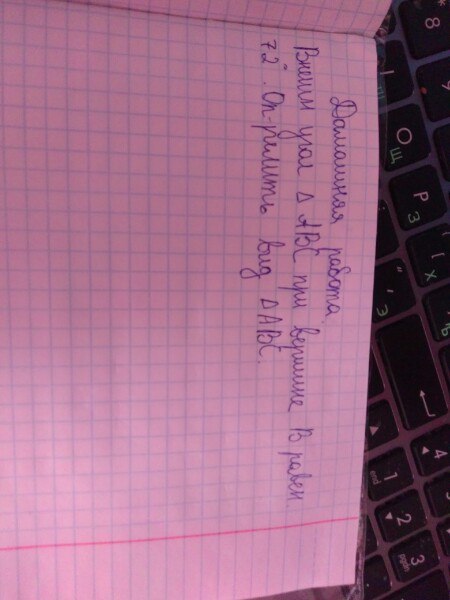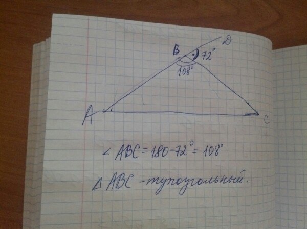 треугольник является тупоугольным, т. к. ∠В=180-72=108°, это тупой угол, т.к. его величина больше 90°