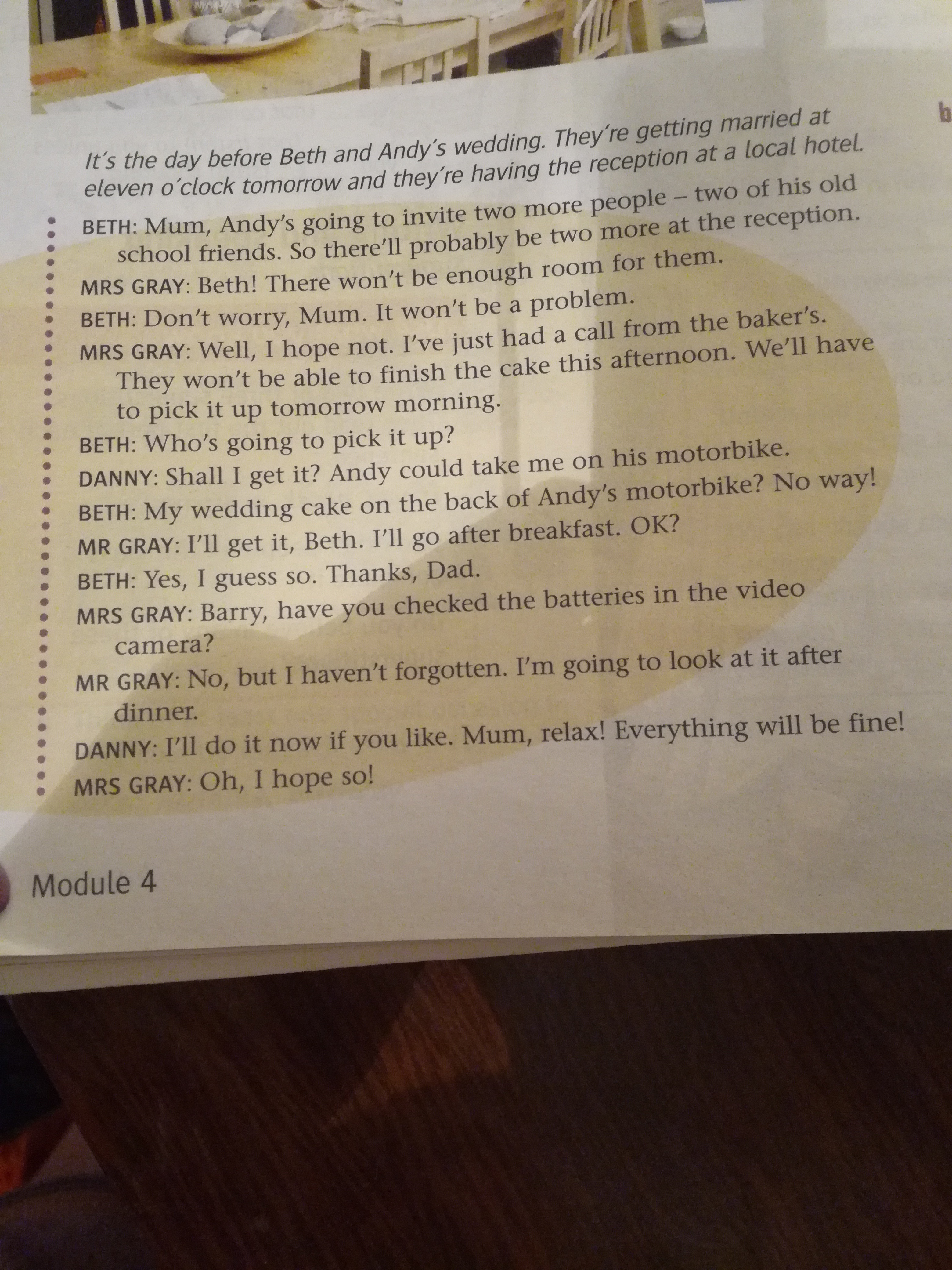 Це день перед Бет і весілля Енді. Вони одружуютьсяодинадцять годин# завтра #і вони знову влаштовуємо прийом Ата місцевої готелі- двох своїх старихшкільних друзів. Так ні! напевно, ще два на стійці реєстраціїМісіс Грей: Бет! Там не вистачить місця для них.Бет: не хвилюйся, мамо. Це не буде проблемою а.Місіс Грей: Ну, І не сподіваюся. Я просто а дзвінка від пекаря.Вони не зможуть закінчити цей день торт. У нас будезабрати його завтра вранці.Бет: хто збирається його забрати?Данні: повинні зробити це? Енді міг би відвезти мене на своєму мотоциклі.Бет: мій весільний торт на задній частині мотоцикла, Енді? Ні в якому разі!Містер Грей: я візьму його, Бет. Я піду після сніданку. ОК?Бет: Так, я так думаю. Спасибі, Тату.Місіс Грей: Баррі, ви перевірили батареї відеокамери?Містер Грей: немає, але І не забули. Я збираюся дивитися на нього післявечерю.Денні: я зроблю це прямо зараз, якщо хочеш. Мама, розслабся! Все буде добре!Місіс Грей: Ох, І сподіваюся на це!Модуль 4