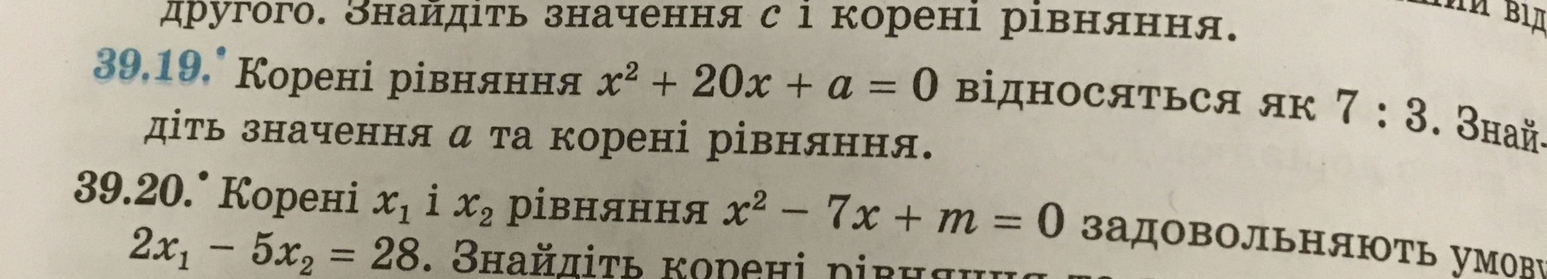 Х1+Х2 = -b. Т.е. 7у+3у=-20 10у=-20 у = -2 Тогда Х1=7*(-2) = -14, а Х2=3*(-2) =-6. По теореме Виета Х1*Х2 = а. Значит а = -14*(-6) = 84