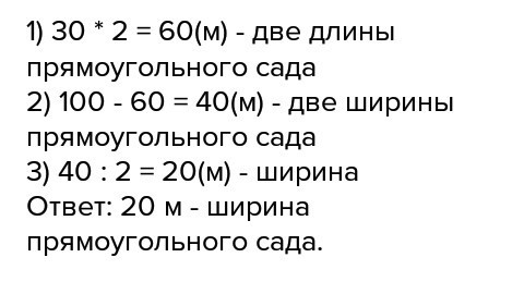 Длина сада прямоугольной формы 30 метров на изготовление забора вокруг сада потребовалось 100 метров сетки Сколько квадратных метров площади сада занимают яблони если площадь под яблонями составляет 2 части всей площади сада