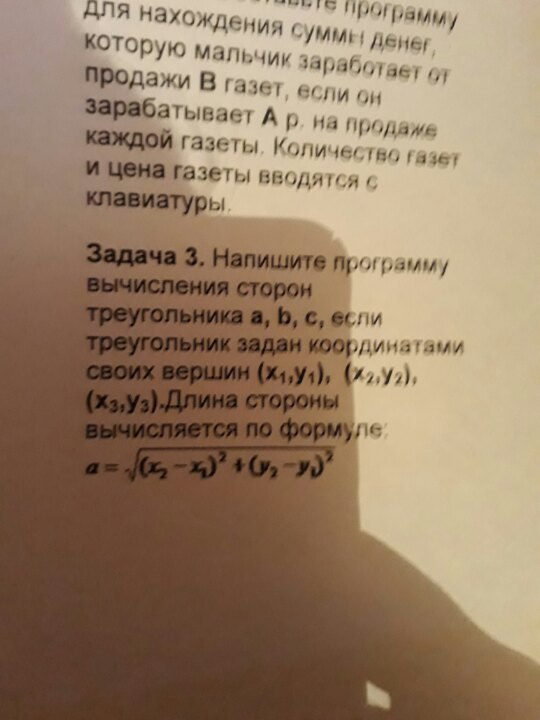 напишите программу вычисления сторон треугольника a, b, c, если треугольник задан координатами своих вершин (х1:y1), (x2:y2), (x3:y3).