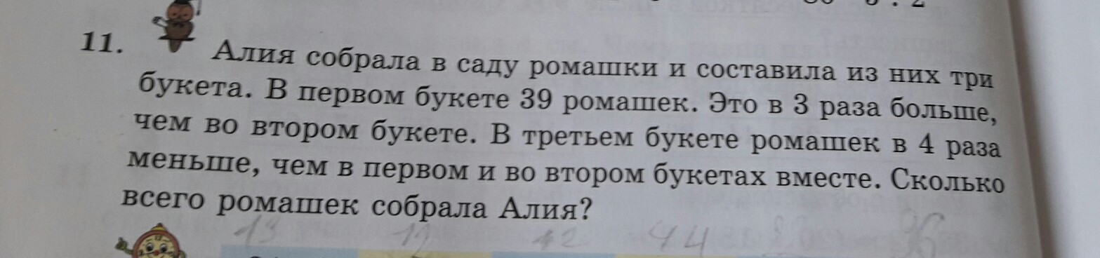 1) 39÷3=13 ( р.) во втором букете.