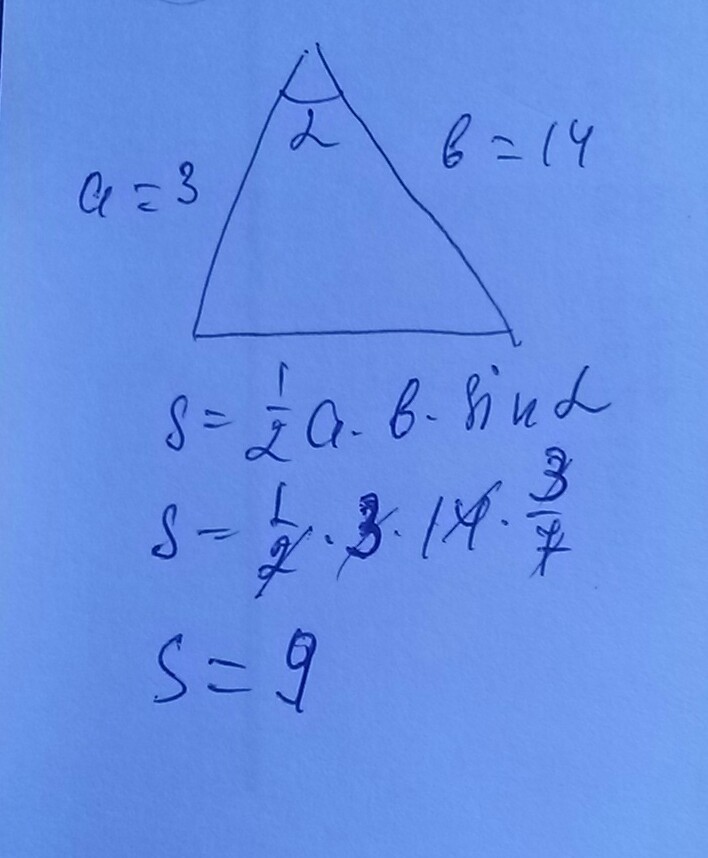 в треугольнике две стороны равны 3 см и 14 см а синус угла между ними равен 3/7 найдите площадь дпнного треугольника
