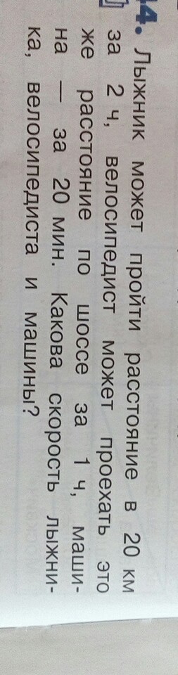 20/2=10 км/ч - лыжник 60/ 2= 30км/ч. -вело 20/20=1км/м. Машина