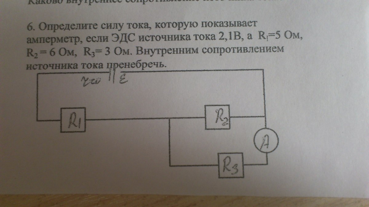 Отпределите силу тока, которую показывает амперметр, если ЭДС источника тока 2,1В, а R1=5 Ом, R2=6 Ом, R3=3 Ом. Внутренним сопротивлением источника тока пренебречь.