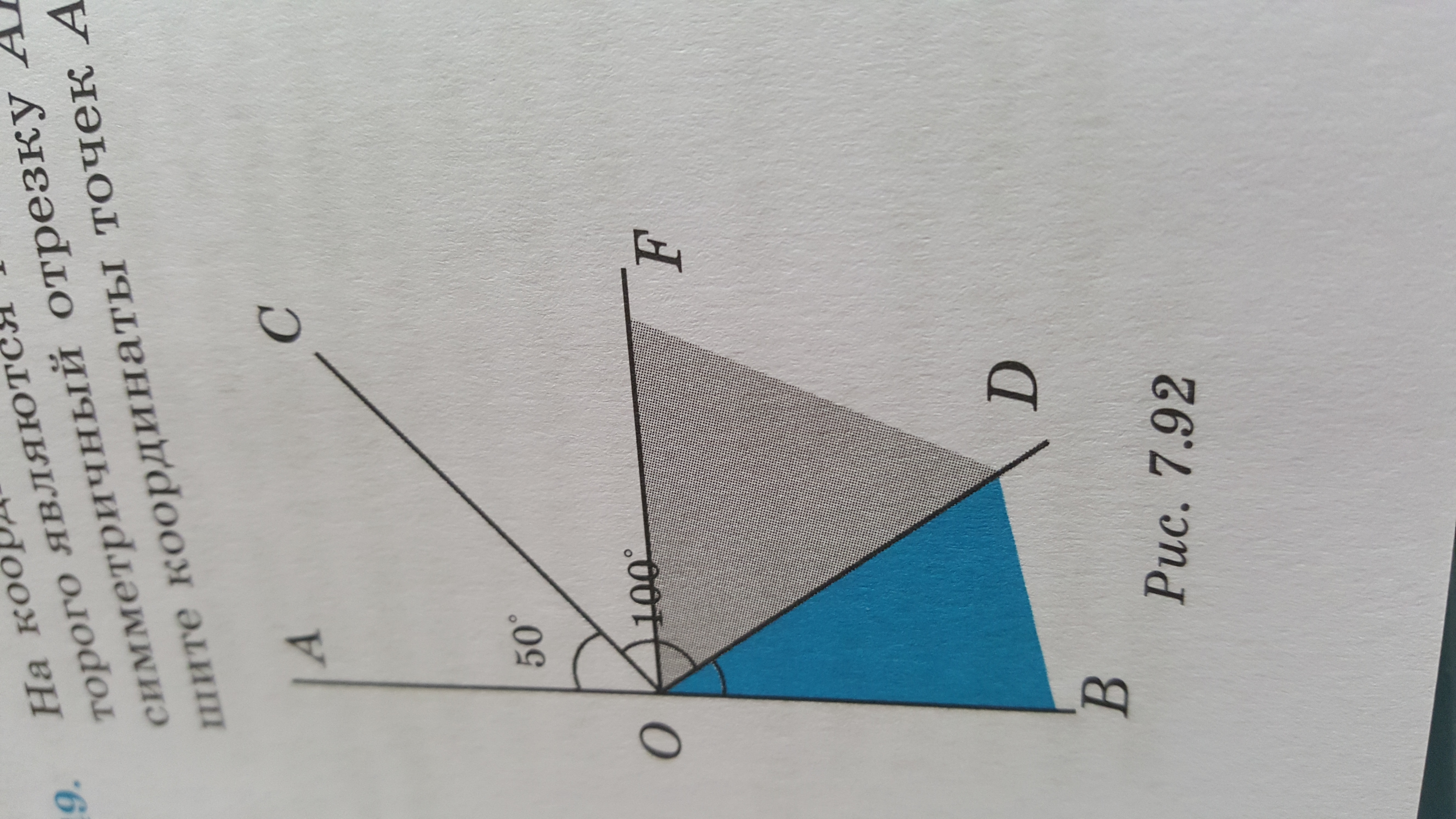 прямой AB проведен перпендикуляр OF . угол COD = 100 градусов угол AOC=50 градусов найдите грпдусные меры углов BOD и DOF(рис 7.92)