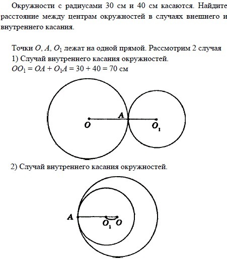 окружность радиусом 30 сантиметров и 40 сантиметров касаются друг друга. Найдите расстояние между центрами окружностей в случае внешнего и внутреннего касания