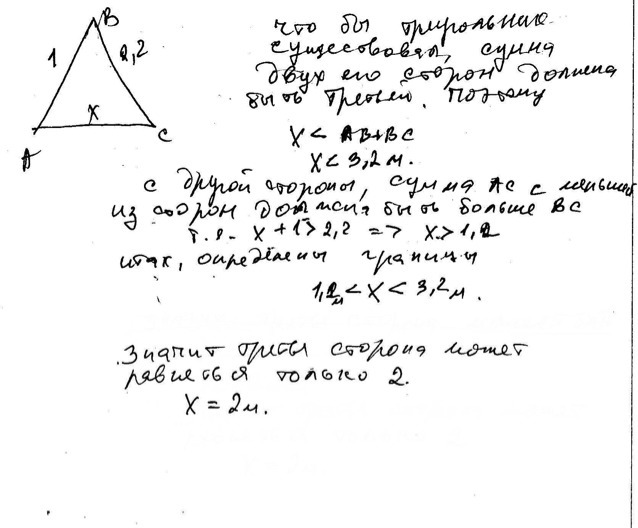 Две стороны треугольника соответственно равны 1м и 2,2м. Какой длины должны быть третья сторона , чтобы треугольник существовал?
