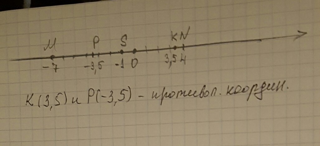 Отметьте на координатной прямой точки M(-7), N(4),K(3,5),P(-3,5),S(-1). Какие из отмеченых точек имеют противоположные координаты?