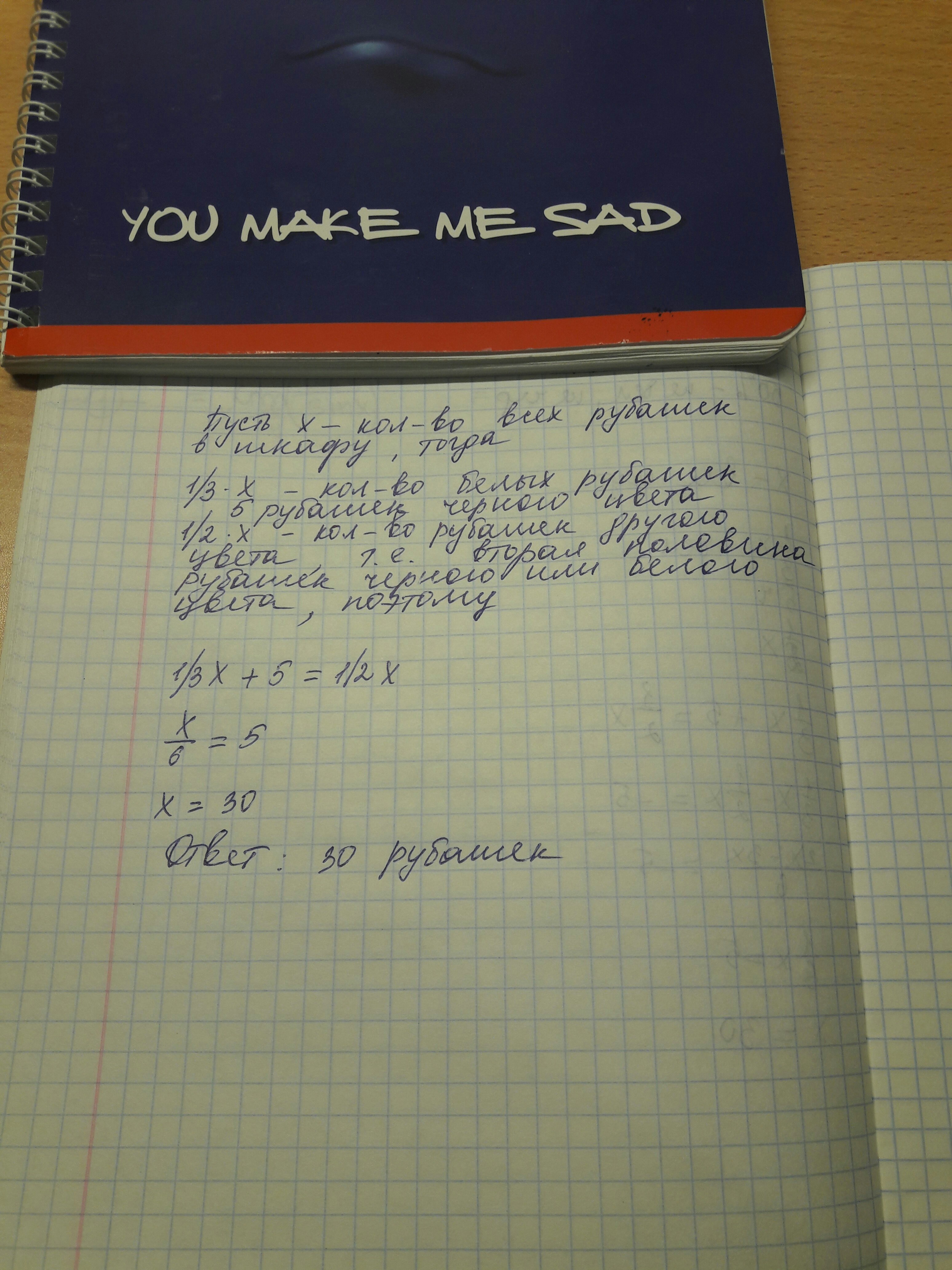 в шкафу висели рубашки из которых 1/3 были белого цвета, а 5 рубашек - черного. Сколько всего рубашек было в шкафу, если 50% из них не были ни белыми ни черными. Прошу решение с объяснением.