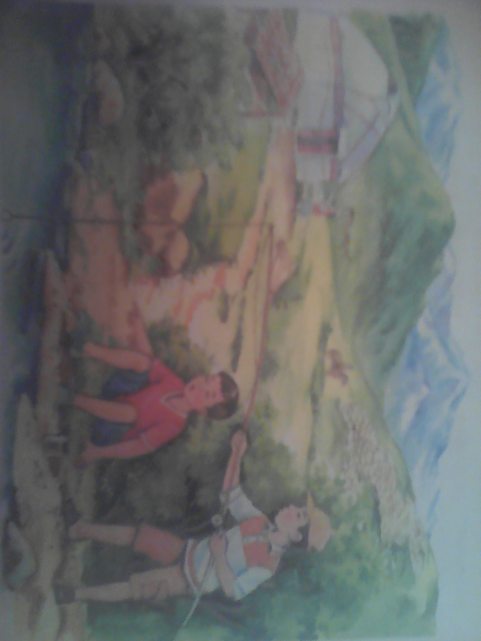 суретте кең жəне əдемі дала көрсетіледі.мұнда биік көптеген гүлдерден таулар бар.Алыста ат жүгірді.Ат қоңыр,оның жал қара.Шөп өте жасыл .Бұлттар ақ, аспан көк.Киіз үй əдемі нақышпен.Ұлдар отырады.Олардың бірі балықты аулайды. Көк өзенде көптеген əртүрлі балықтар жайлайды.