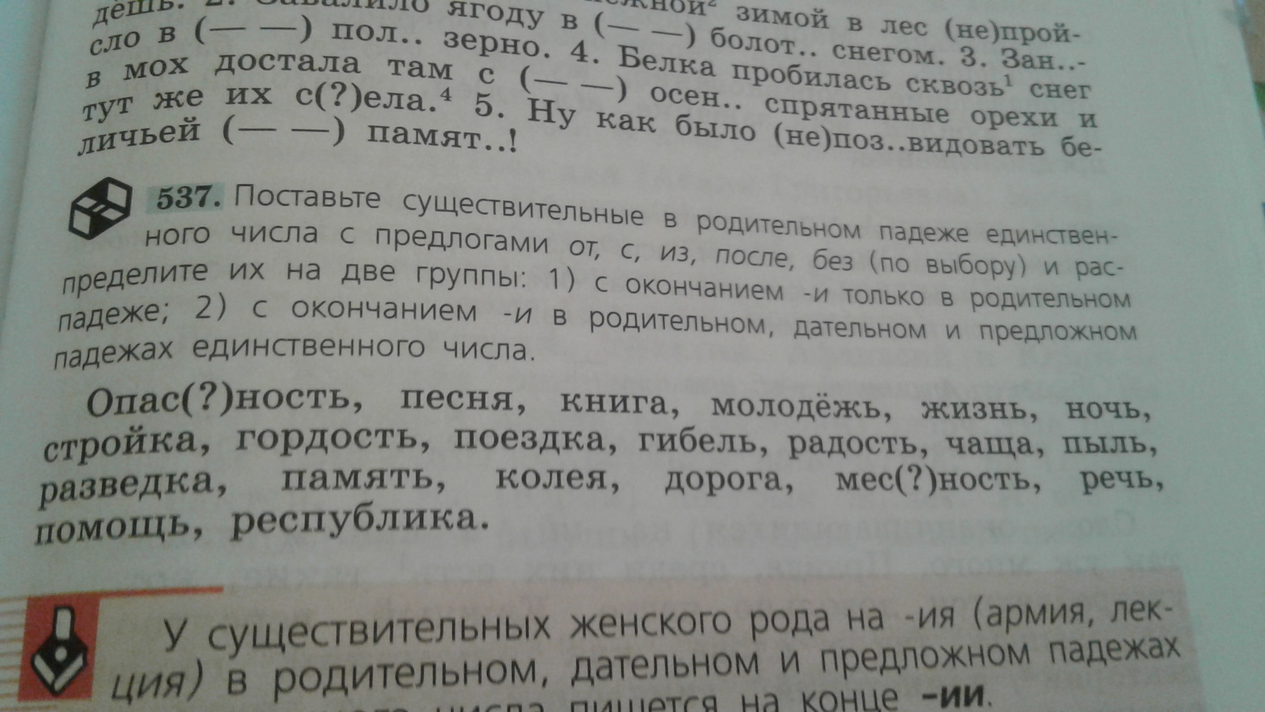 2)Из опастности,от молодежи,после ночи,от гордости,от гибели,от радости,без пыли,от памяти,из местности,без речи,без помощи.