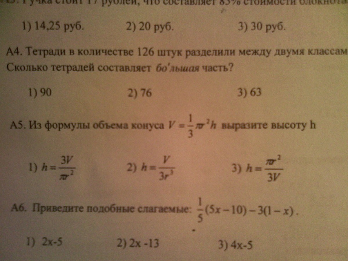 Здесь ответ 1. Тут надо сначала в правой части вместо числа один подставить пи*радиус в квадрате*высоту,потом пи*р в квадрате*высоту=3V => после 3V делим на пи*р в квадрате