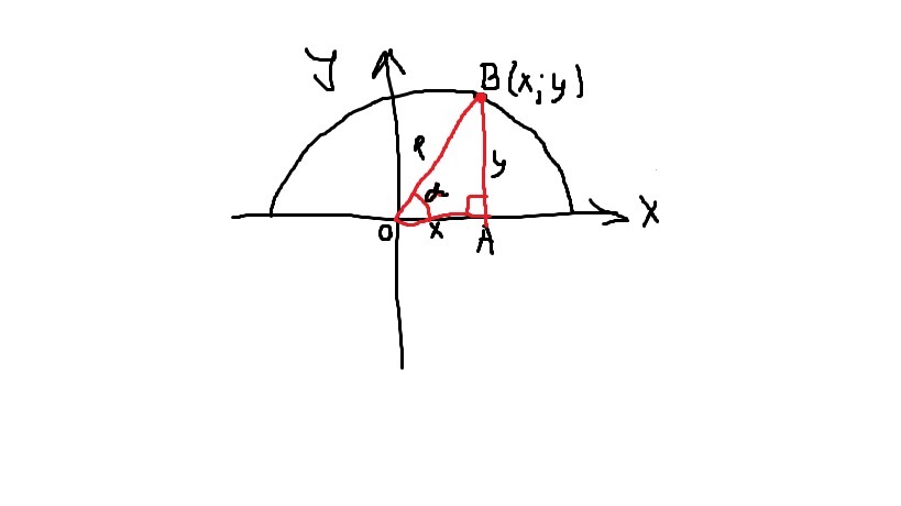 Пускай x и y - координаты точки В единичного полукруга(рисунок). Из прямоугольного треугольника АОВ получим: у^2+x^2=1.