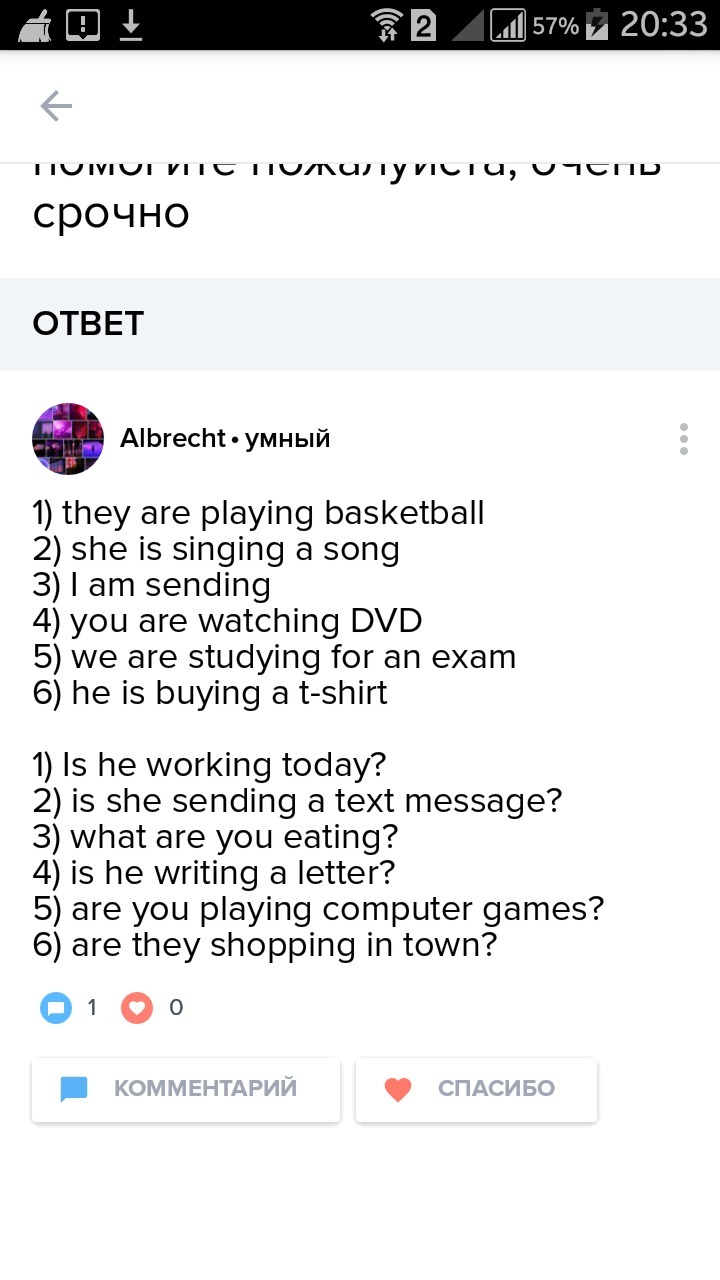 1) они играют в баскетбол 2) она поет песню 3) я посылаю 4) ты смотришь DVD 5) мы учимся на экзамене 6) он покупает футболку 1) Он сегодня работает? 2) она посылает текстовое сообщение? 3) что вы едите? 4) он пишет письмо? 5) Вы играете в компьютерные игры? 6) они ходят по магазинам в городе?