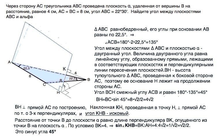 Через сторону AC треугольника ABC проведена плоскость альфа, удаленная от вершины B на расстояние, равное 4 см, AC = BC = 8 см, угол ABC = 22 градуса 30 минут. Найдите угол между плоскостями ABC и альфа.