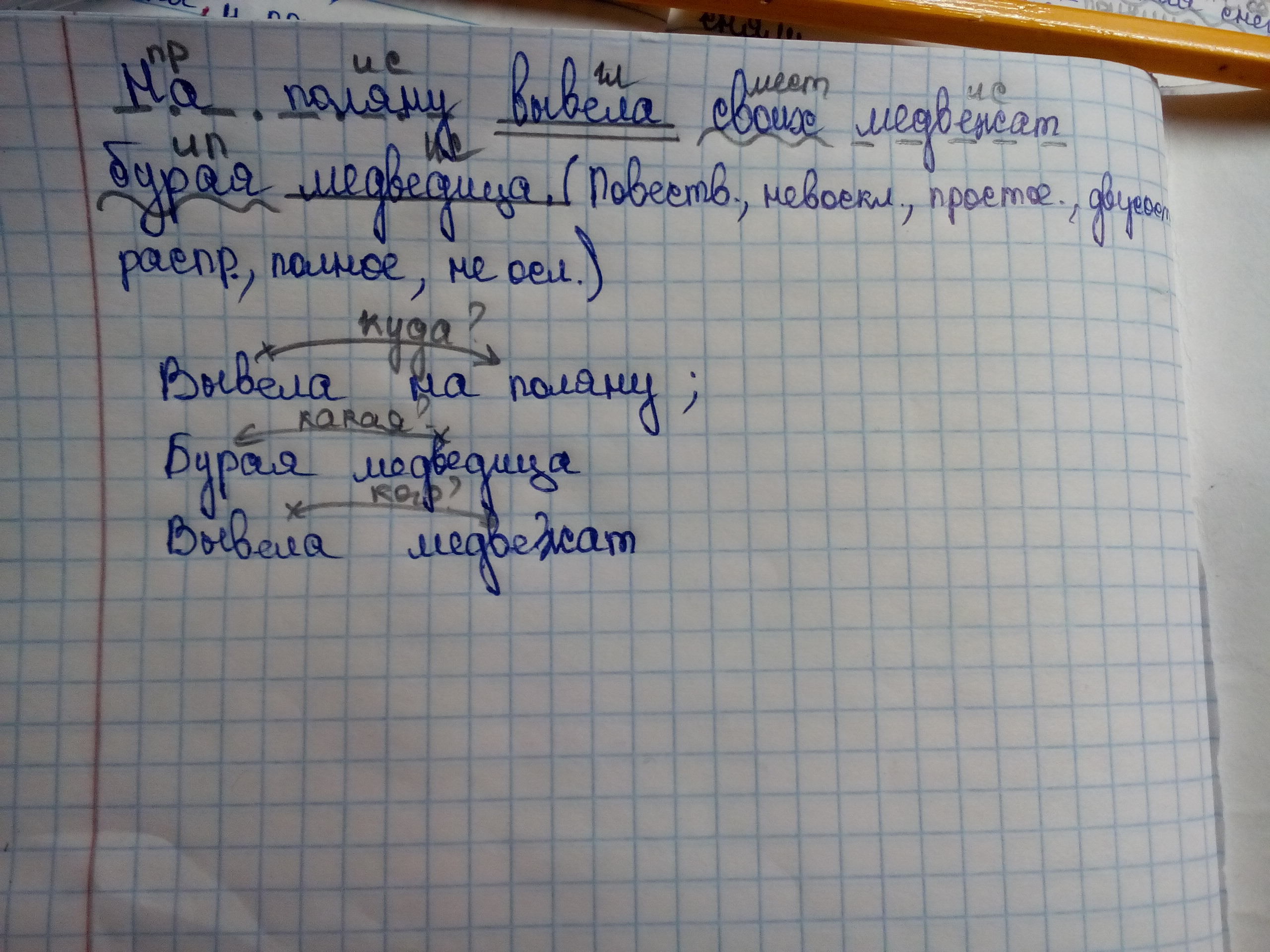 "На поляну вывела своих медвежат бурая медведица", дать характеристику предложения, выполнить синтаксический разбор ,выписать словосочетания