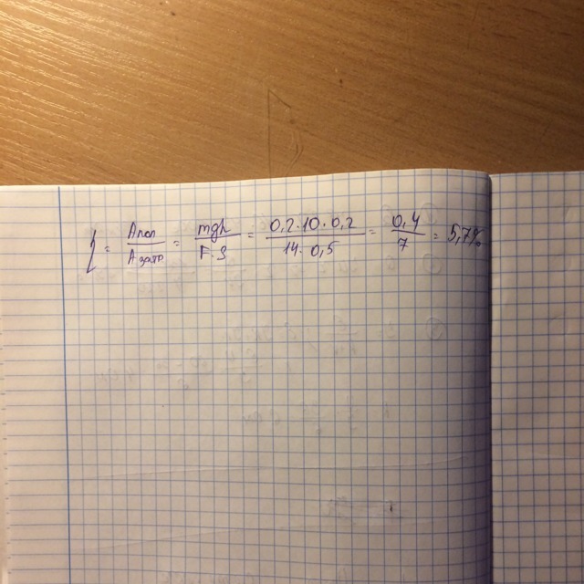 Поднимая груз массой 200г, по наклонной плоскасти высота 20см, прилагают силу 14, длина наклонай плоскасти 50см, найти КПД наклонной плоскасти